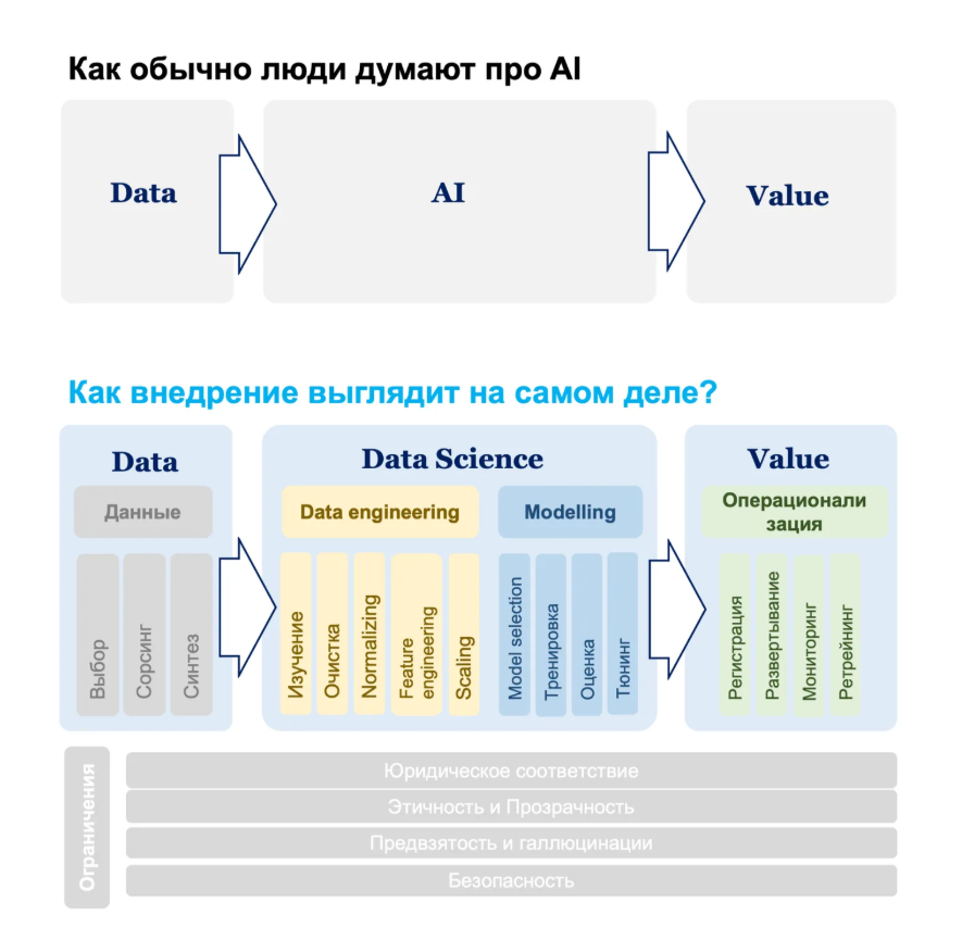 Именно поэтому в ИИ⁠-⁠трансформации сама модель не является центральным компонентом. Она важна, но это только часть решения. Если грубо, первые 10% результата дают алгоритмы. Еще около 20% дают технологии, данные и интеграции. А основные 70% — это люди, процессы и изменения в операционной модели. Победит тот, кто сумел встроить ИИ в реальные сквозные процессы компании.